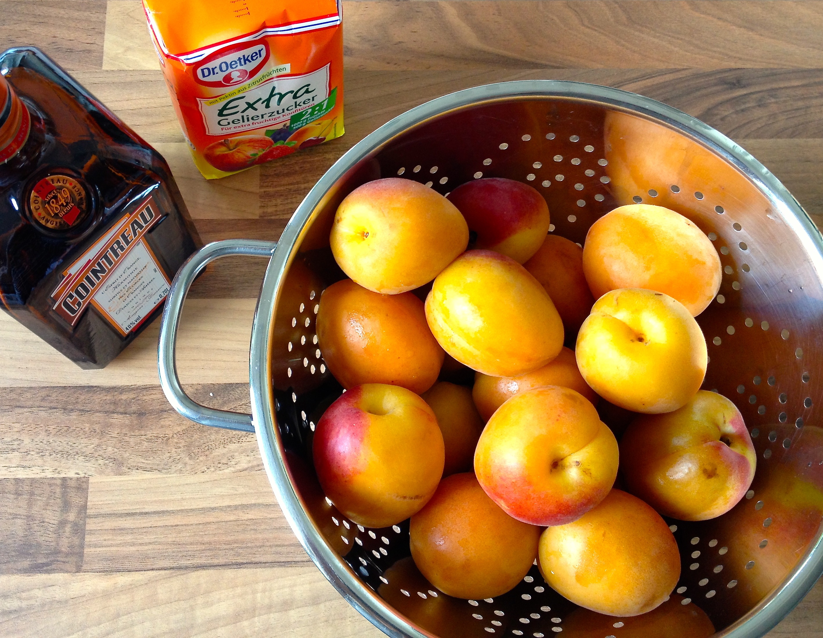 Experimentieren geht natürlich auch bei Marmeladen. Ich mag die eher schlichten und klassischen Marmeladen, mische aber gern ein wenig Alkohol unter die Früchte. Zu Aprikosen passt Cointreau sehr gut, Erdbeeren profitieren von Aperol, sie mögen auch Sekt oder Weißwein. Auf ein Kilo Früchte kommen 100 bis 200 ml des gewünschten „Schuss“, der eignet sich auch gut, um auf eine runde Menge aufzugießen, damit das Kopfrechnen für die Zuckermenge noch leichter wird. Die Zuckermenge muss dann entsprechend angepasst werden.