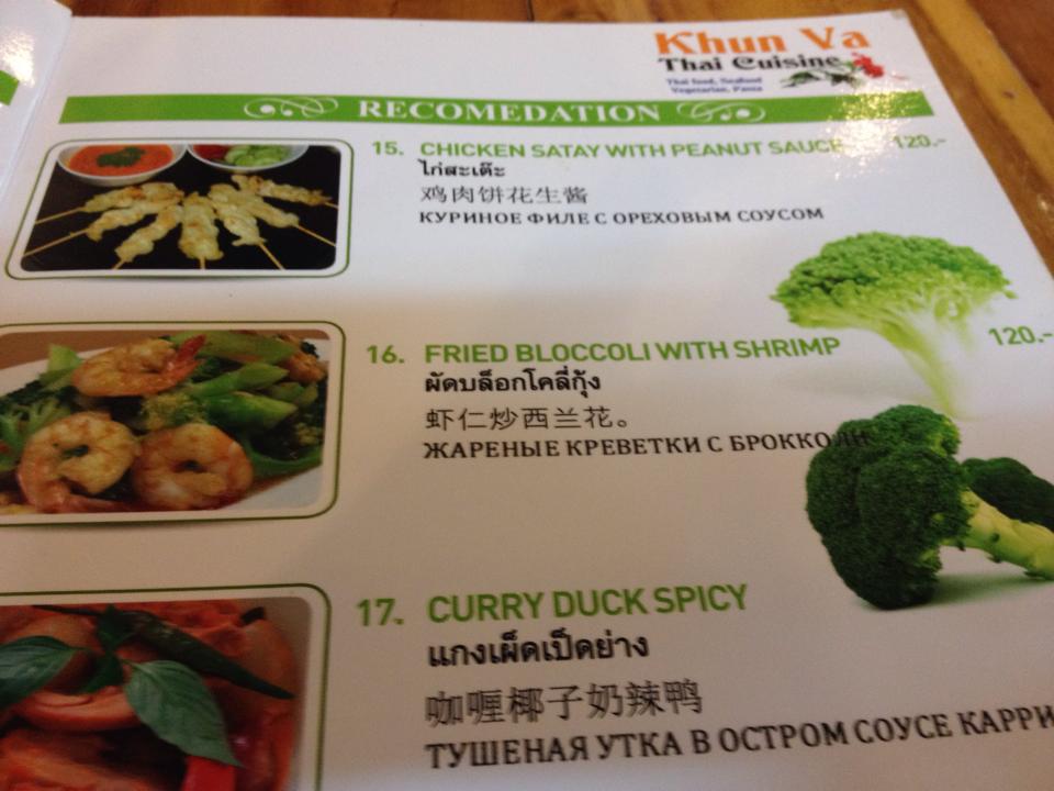 Speisekarten. Auch so ein Thema. Die sind immer zweisprachig, Thai und Englisch, haben oft viele Bilder und gerade in der Abteilung „Western Food“ kreative Schreibweisen. Nun hat das thailändische Alphabet viel mehr Buchstaben als das lateinische und wenn nun ein Thai ein Wort aus einer europäischen Sprache in lateinisches Alphabet transkribiert, dann kann es schon zu kreativen Schöpfungen kommen. Bekannt ist ja, dass das R ein Probleme für viele fernöstliche Muttersprachler darstellt. Dann wird aus Broccoli halt ein Bloccoli gemacht.