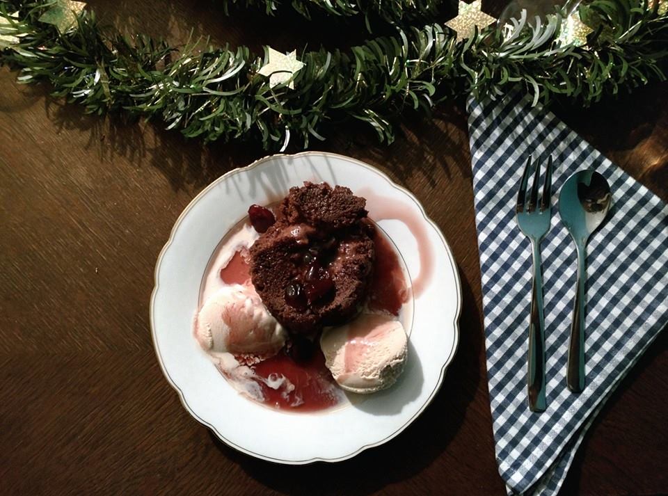 Das große Finale: Ein Schokoladenküchlein mit flüssigem Kern, weihnachtlicher Cassissoße und Eis. Foto: Ronny Nelson.