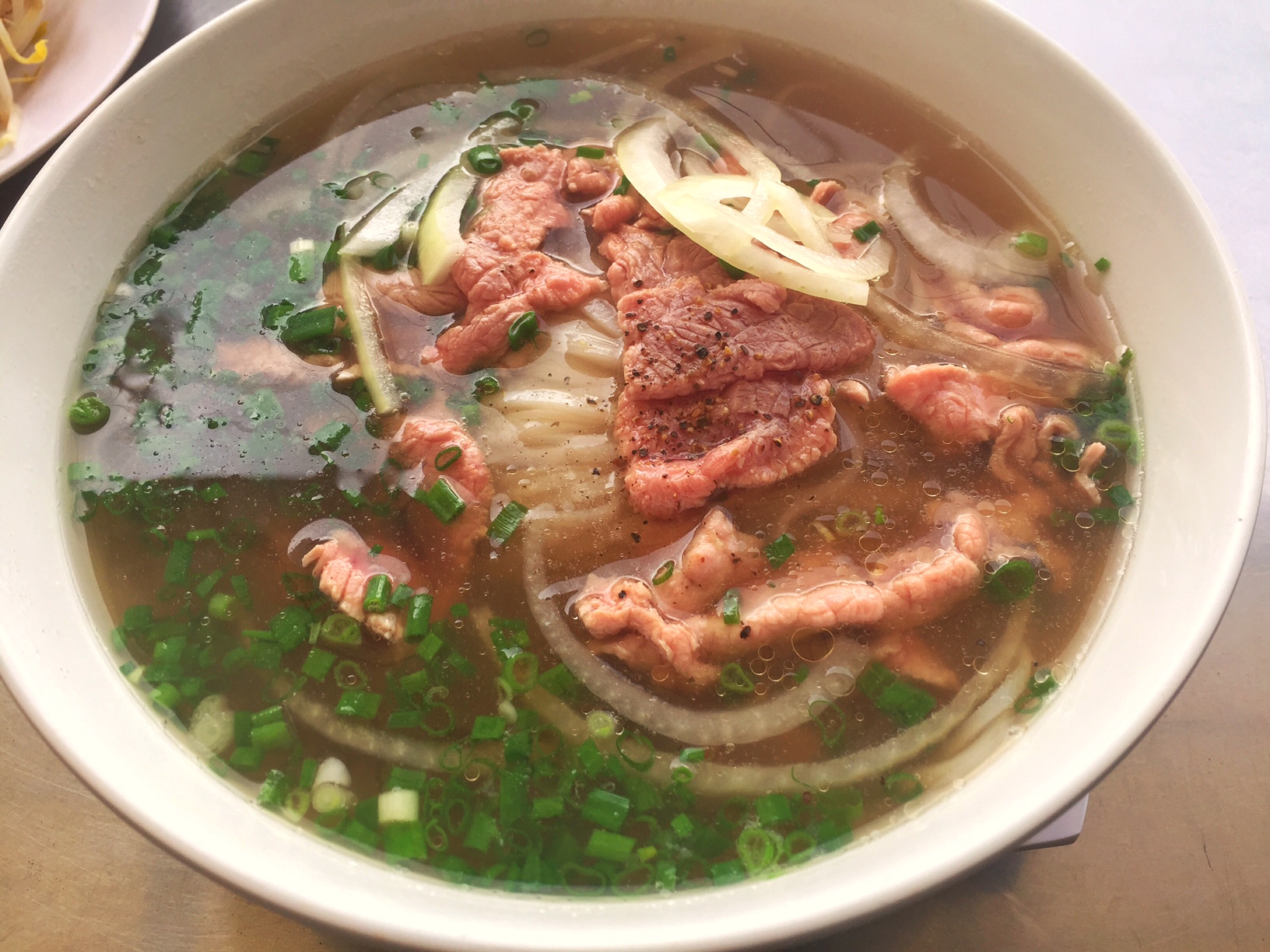 Pho tai: Das Fleisch wird in roh in die Brühe gegeben und gart dort nach.